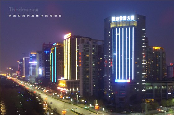 平日模式——隨著夜幕降臨,陜西投資大廈的夜景照明景象也隨之映入眼簾,在上圖中我們可以看到建筑頂部及兩側(cè)采用白色光,加上星星點點的星光燈和建筑底部柔和的黃色燈光,給人一種溫暖而又寧靜的感覺。
