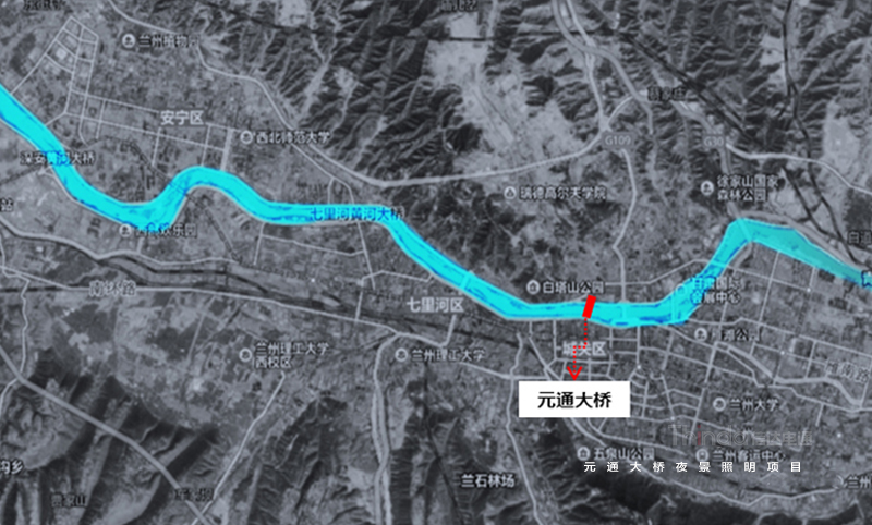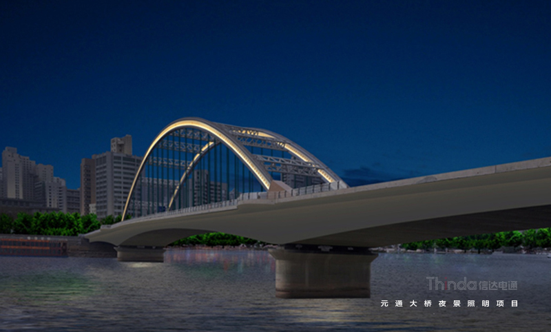 元通大橋北起靖遠路高架橋,主跨跨越黃河,全長459米,屬于城市次干路。信達聯合橋梁照明設計師對元通大橋進行全面調研定并針對橋梁功能、夜景需求進行設計,設計手法動靜結合,簡單與復雜、精致與粗獷、明與暗、虛與實、冷與暖在燈光中體現。